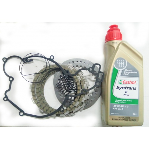 Este kit incluye 6 discos de friccion, 5 discos separadores, 6 muelles, 1 torica tapa embrague, 1 junta tapa embrague y 1 litro aceite castrol.